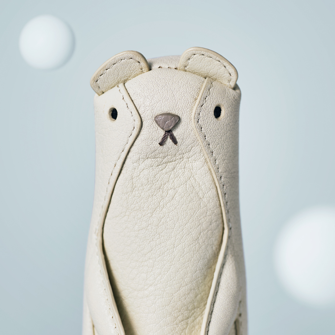 レザーで仕立てた鼻や縫いで仕上げた口元など、細かな顔のパーツでその愛らしい表情を表現。 さらに、耳の生え方や頭の形、頭の下にあるくびれといった特徴も、職人の手仕事で表現した。