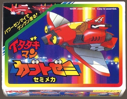 『イッパツマン』は、パッケージに「フジテレビ系全国放映中」の番宣デザインが入っているのが特徴。一昔前では当然のようにゼンマイ走行になった商品を多く感じるが、時代はリアル路線に入っているので動力はない。『イタダキマン』はシリーズ終了タイトルであるが、マーク社としても最後のプラモデルだったようだ。