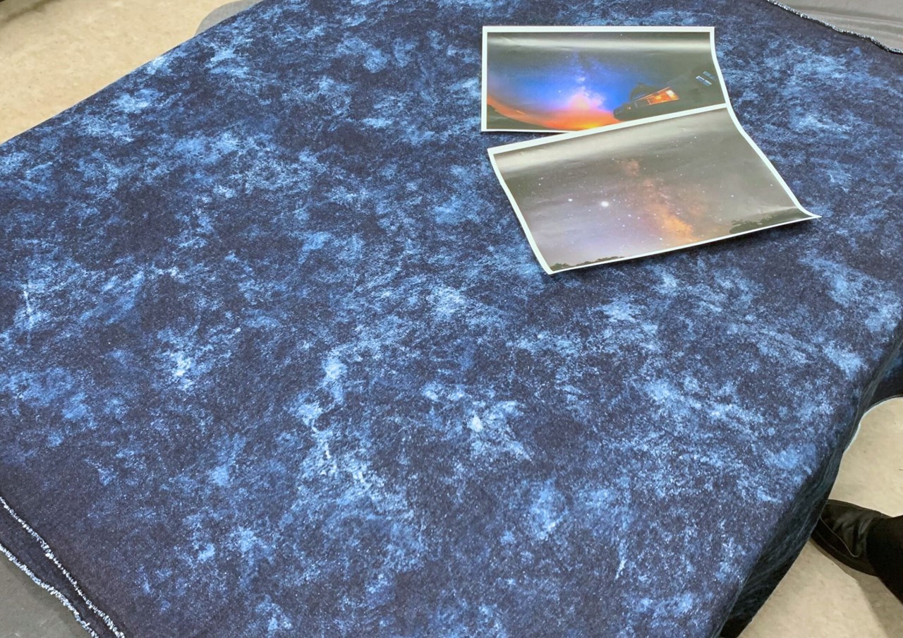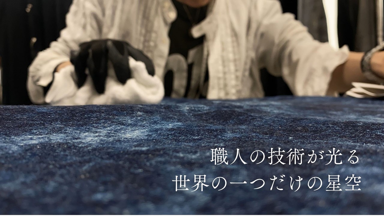 井原の染色職人が手作業でブリーチを施すことで完成する「美星デニム」。一反ずつ手作業で仕上げるため、同じ星空のデニムは一つとして存在しない。ぜひ、自分だけの「美星デニム」を手に取ってほしい。
