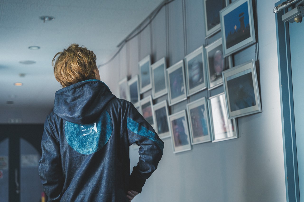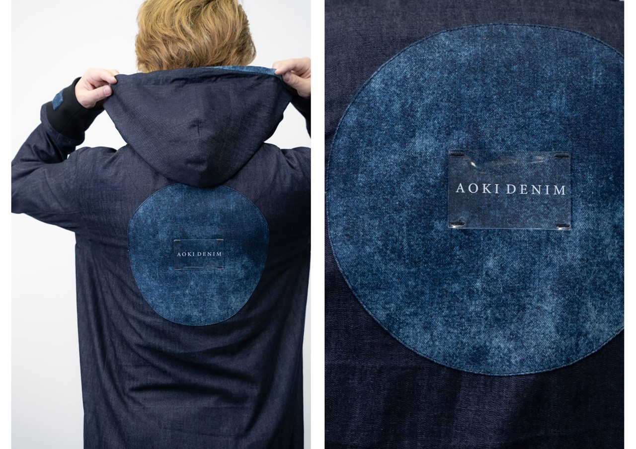 バックには満月が浮かび上がるデザインを採用。中央にはAOKI DENIMのロゴ入りクリスタルパッチを装飾。深い藍色と美星デニムの鮮やかな紺碧のコントラストが際立つ、美しいバックスタイルとなった。
