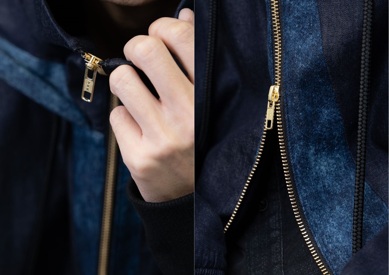 フロントファスナーには、重厚感のあるゴールドを採用。ゴールドの輝きがデニムパーカーのアクセントとして映える。左袖には青木被服のロゴリベットが付き、美星デニムの上に輝くワンポイントとしてデザインされている。