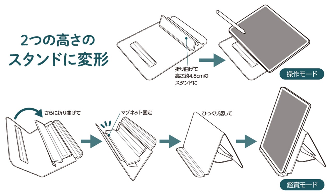 「iPad 11インチ用スタンドスリーブ」は、折りたたむことでスタンドに変形する11インチサイズのiPad用スリーブケース。スリーブケースを折り曲げるだけの簡単操作で、緩やかな傾斜でタッチペンを使用した作業がしやすい「操作モード」と、角度をつけて鑑賞に適した「鑑賞モード」の2種類の高さに変形可能。マグネットで固定するため、安定した使い心地を提供する。