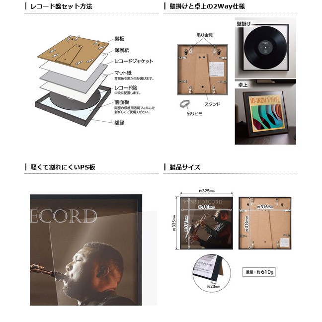 付属の背景マット紙を使用すれば、レコード盤そのものを飾ったり、10インチレコードジャケットを飾ることも可能。壁掛けとしてはもちろん、デスクなどに置けるスタンドも付属している。