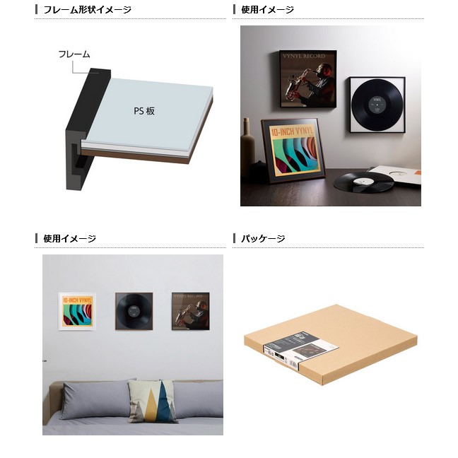 LPレコードを写真や絵画のように飾れるインテリアフレーム。12インチのLPレコードジャケット(310~315mm角)がぴったりと収まり、薄枠でシンプルなデザインがインテリアに自然になじむ。