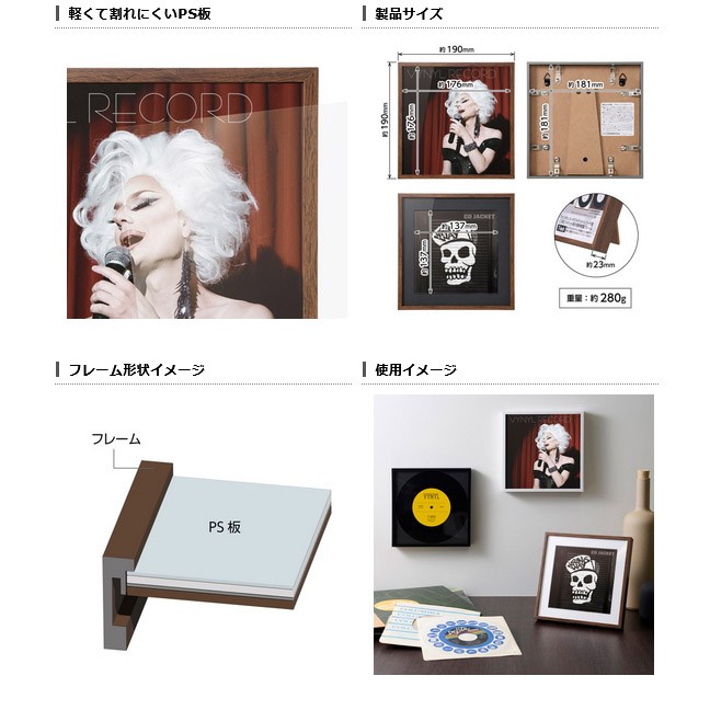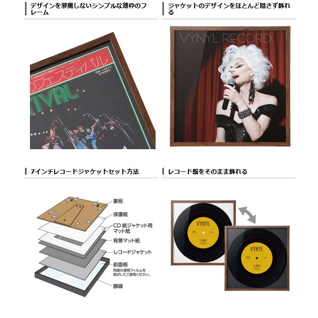 7インチレコードやCDの紙ジャケットを写真や絵画のように飾れるインテリアフレーム。7インチのシングル盤やEP盤のレコードジャケット(180mm角)がぴったりと収まり、シンプルなデザインで部屋のアクセントとしても活用できる。