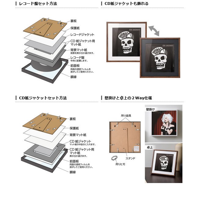 付属の背景マット紙を使えば、レコード盤そのものを飾ることも可能。また、CDの紙ジャケット(135mm角)を飾るための専用マット紙も付属している。壁掛けだけでなく、デスクなどにも置けるスタンド付き。