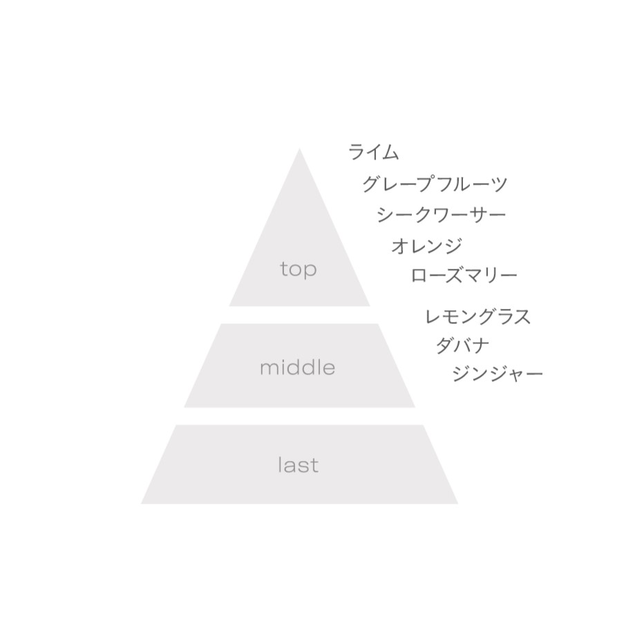 8種の精油をブレンドした、レモネードを思わせるジューシーな香り。ほんのり苦味のあるシークワーサーやライムに、グレープフルーツやオレンジなどのフルーティーなシトラスをブレンドし、個性的なジンジャーやダバナをアクセントにプラス。甘酸っぱいシトラスの中に、グリーン調の爽やかさや潔さを感じさせるレモネードの香りで、どんなシーンでも瞬時にリフレッシュできる。