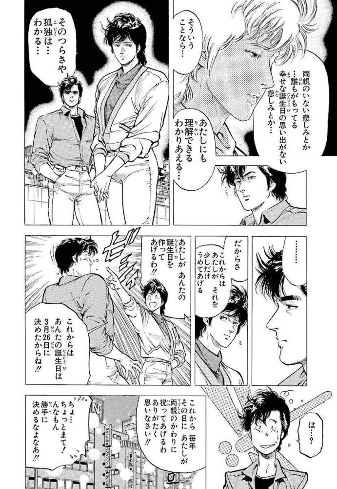 「北条司展」の反響がこの度の「#シティーハンターRyoKaoriバースデー」展につながっている。ところで、獠と香の誕生日をご存じだろうか。香の誕生日が3月31日であることは第6話(恐怖のエンジェルダスト)で示されるが、獠の誕生日が明かされるのは第198話(涙のバースデイ)とだいぶ遅い。というのも、獠は、物心がつかない幼少期に中米上空で飛行機事故に遭遇。奇跡的にジャングルで救出されたものの両親や身元を証明するものを失い、誕生日を知らなかったからだ。獠の過去を知り衝撃を受けつつも、香は二人が初めて出会った日(第5話「闇からの狙撃者!」)である3月26日を獠の誕生日と決める。