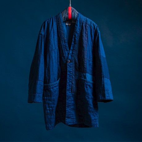 インディゴで染めた麻生地に、さまざまな表情のインディゴ生地を重ね、手刺しを施したハオリジャケットは、手仕事が生み出す温もりを感じられる一着。インディゴ染めした麻は独特の艶を持ち、使い込むことで表面のインディゴが擦れ、ややマットな表情に変化する。あて布として使用したインディゴ生地とともに、異なる青の経年変化を楽しむことができる。リラックスシルエットを採用し、後ろ身頃にわずかなカーブを加えることでモダンな印象を与え、使いやすさを考慮して大きめのポケットはやや低めの位置に配置されている。