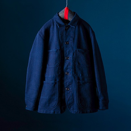 ワークスタイルのディテールを取り入れたベーシックなカバーオールは、聖林公司が大切にしている代表的なアイテムの一つである。「BLUE BLUE JAPAN」のシグネチャーファブリックであるホンアイサシコをベースに、軽さと着心地を追求し、従来の生地より糸の打ち込み本数を調整して独自のサシコ素材を仕立てた。カセ染めした本藍の糸を使用し、ドビー織機による二重織で厚みと弾力を持たせながらも軽やかな仕上がりを実現。糸の染色から仕上げまでの工程で高温乾燥を避けることで、柔らかく膨らみのある風合いに仕上げている。大きなポケットや低めに配置した胸ポケットなどのワークスタイルのディテールが特徴で、内側にも使いやすい位置にポケットを備えている。ボタンには木の実を原料としたナットボタンを使用し、手作業で本藍染めを施すことで、ジャケット全体にわたる藍色の経年変化を楽しめる。
