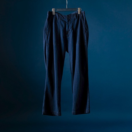 ベーシックなファティーグパンツは、サイズ感やシルエットにこだわり、現代的なフィット感にアップデートされている。伸縮性があり、動きやすさもポイントである。コットンとテンセルの糸で交織したツイル素材は、適度なハリと光沢を持ち、ポリウレタンを使用しているためストレッチ性も兼ね備えている。経糸にインディゴ糸を使用したINDIGOカラーと、真っ黒のBLACKカラーの2色展開。フロントは使いやすいファスナー仕様。大きなパッチポケットや後ろのフラップポケットのディテールはそのままに、ヒップ周りと裾に向けてのシルエットをストンと落ちるようにデザインされている。