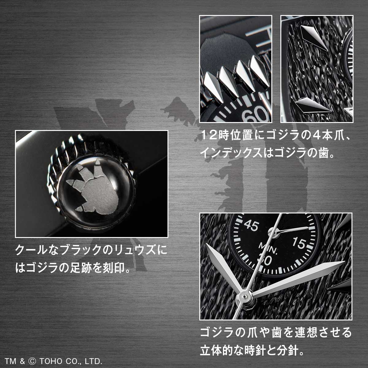 12時位置にはゴジラの爪、インデックスには鋭い歯をデザインしている。さらに、時針と分針もゴジラを想起させる立体的な造形を採用した。