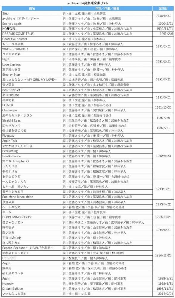 今井 永(のり)と今井 久(ひさ)の双子の姉妹からなるa・chi-a・chi(アチアチ)は老神温泉で有名な群馬県の沼田市の出身だ。1987年暮れと1988年正月明け、その沼田の温泉旅館に当時ビクター音楽産業(現・ビクターエンタテインメント)に所属していた金子秀昭氏が宿泊したことから、彼女たちのシンデレラストーリーが始まる。