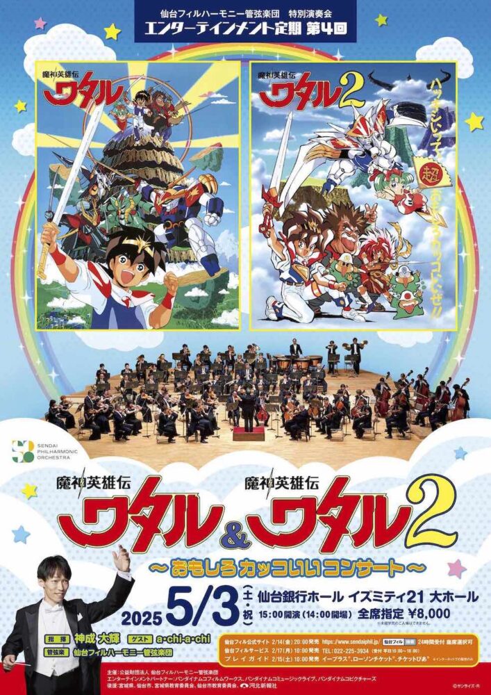 シリーズ最新作『魔神創造伝ワタル』が2025年1月から放送されて話題の『ワタル』シリーズ。そんな『ワタル』シリーズから、『魔神英雄伝ワタル』『魔神英雄伝ワタル2』の主題歌と劇伴をオーケストラサウンドにてお送りいたします。杜の都でも「おもしろカッコいいぜ!」