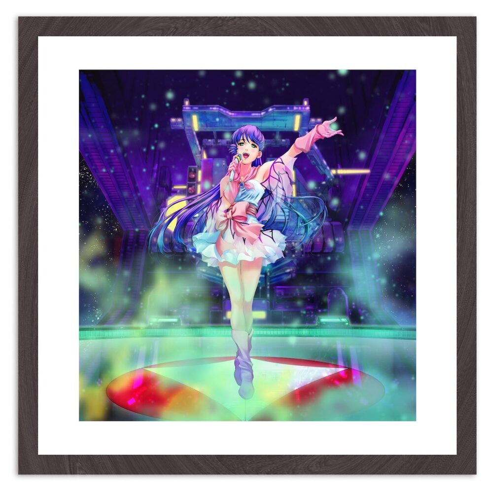 何か説明するほどのことではなく、もうドストレート。「マクロス35周年 × 羽田健太郎 10th Memorial 『超時空管弦楽』 remember ヘルシー・ウィングス・オーケストラ」(※6)のキービジュアルで描かせていただいたのです。スタッフの方もすごくよく描いていただきました。後ろのブリッジなどはこちらでラフを描いてますけれど、(細部は)スタッフによるものですね。こちらで色を塗って仕上げたんで、ほとんど合作みたいなものです。背景のブリッジなんかはメタルキャンパスアートになると重量感があっておもしろい感じになるんですよね。