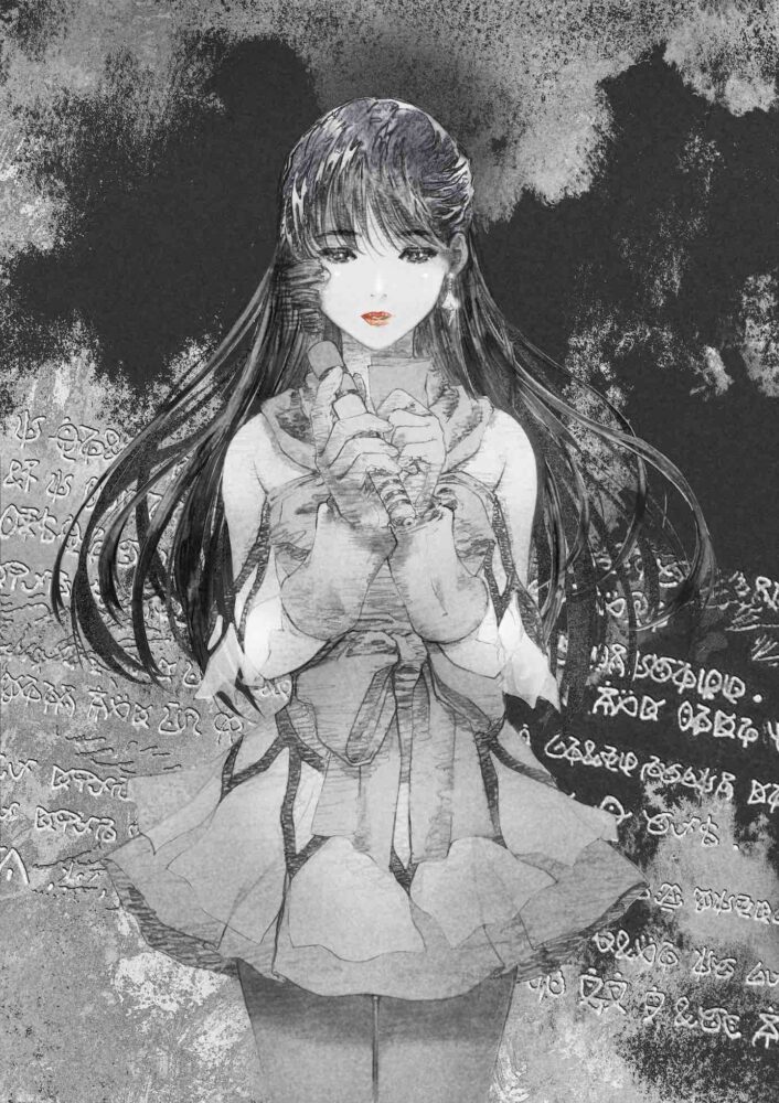 カバーの絵を描いている頃はインフルエンザの真っ最中で。体調だけではなくて精神的にちょっとダウンしている状況がしばらく続いてしまっていて、とても自分では決められないから編集部とデザイナーも含めた皆さんに意見を聞いて。それに、自分で決めちゃうと、また自分のパターンみたいになってしまう。その中で一人、「流れを表紙から何枚か続けたらどうか」と言うんで。だからこのカバーで歌詞カードを受け取って見ている、その次にカラーで目を開いて歌っている感じにして。画集の本編があって、その後にその歌詞カードを上げる。(ミンメイが)上を見るっていうのは裏表紙にあります。じゃあそれに沿ってやってみようかと。