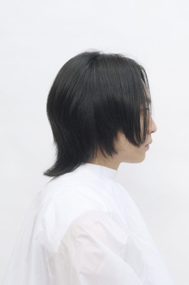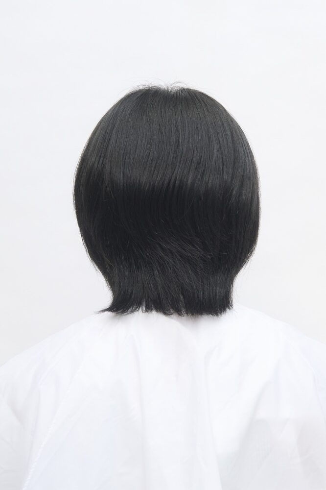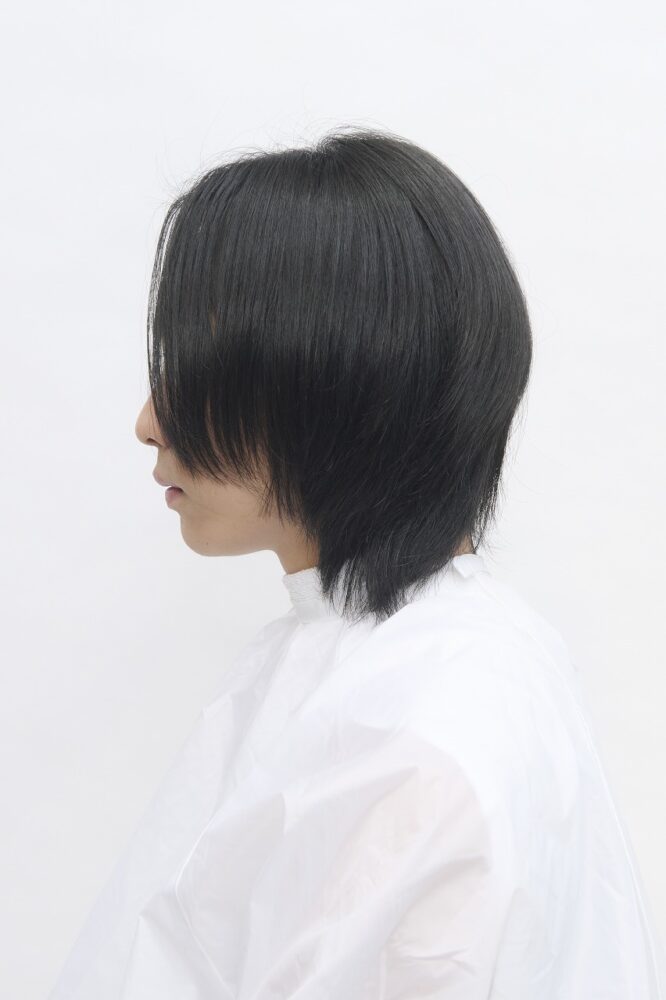 表面と顔まわりにレイヤーが入ったミディアムベース。毛先は全体的に軽さが入っていて、トップからえり足までつなげてカットしてある。カラー履歴はなく健康毛。