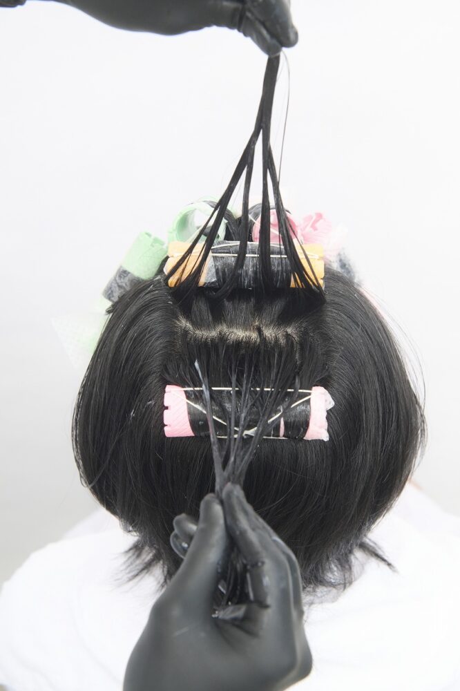 トップ1段目はウィービングパーマ。チップと間隔を1:1の分量でウィービングする。