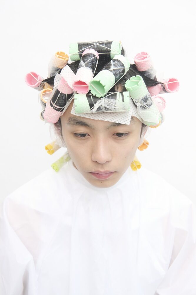 表面はアップステムで根元を立ち上げる。右フロントは26㎜で平巻き。左フロント、左のこめかみ部分は右と同じ考え方だが、全体の毛流で溜まりやすいため、それぞれ29㎜にロッド径を上げる。