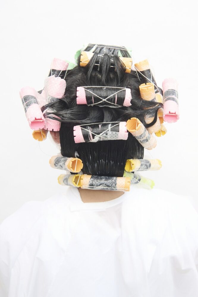 えり足はセンターはウィービングせず、23㎜で逆巻き。左右は耳後ろをウィービングして20㎜で逆巻き。その下、落とした毛束を17㎜で逆巻きにする。
