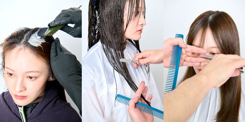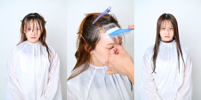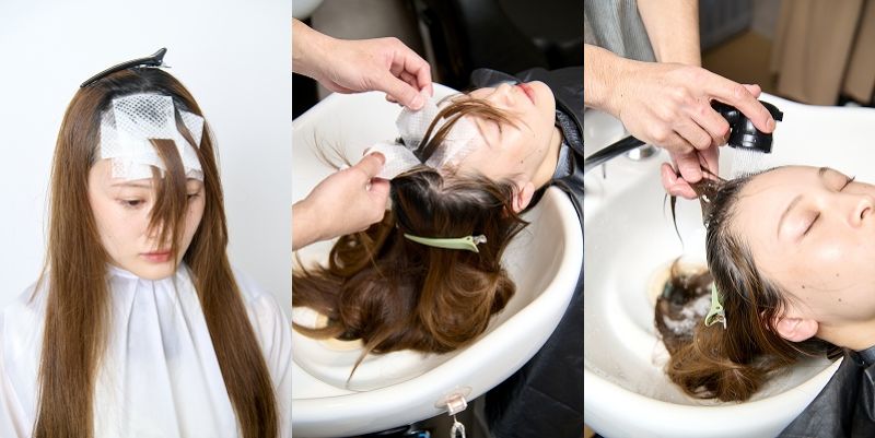 - やさしく前髪を持ち、水圧だけで薬剤を流す。押さえて流すと根元に変なクセがついてしまう。水洗後はタオルで軽く押さえる程度に水分を拭き取る。