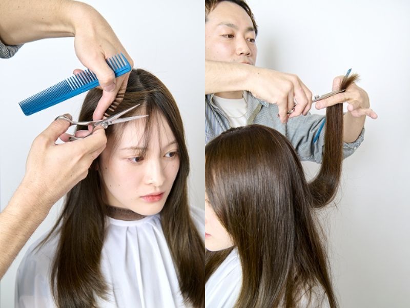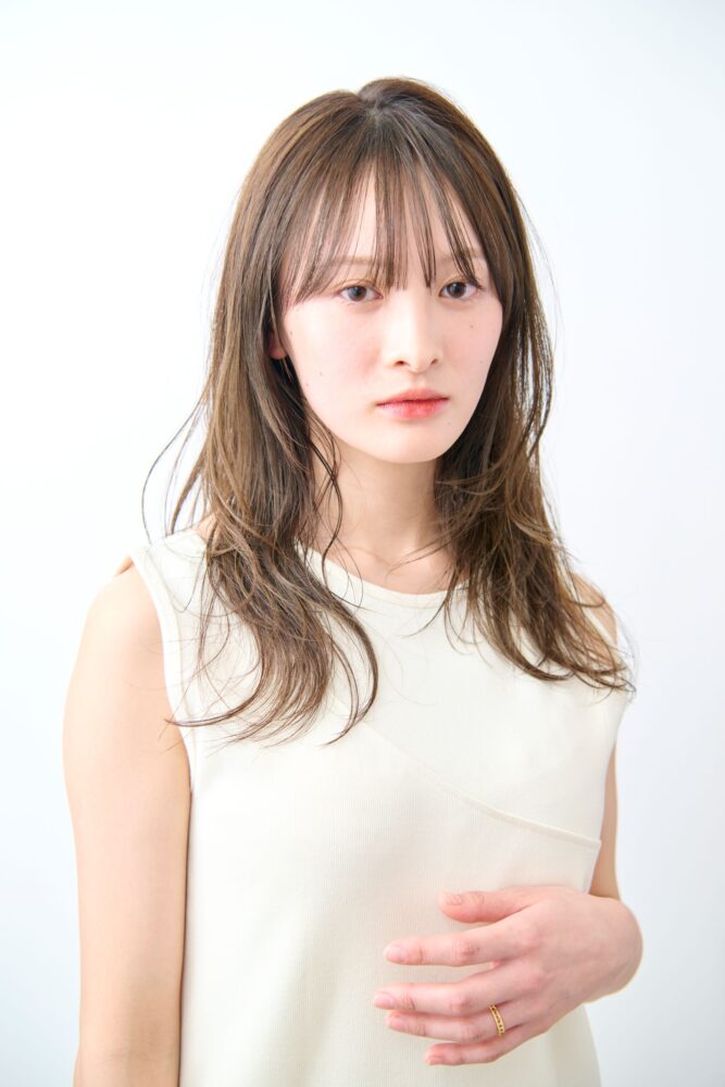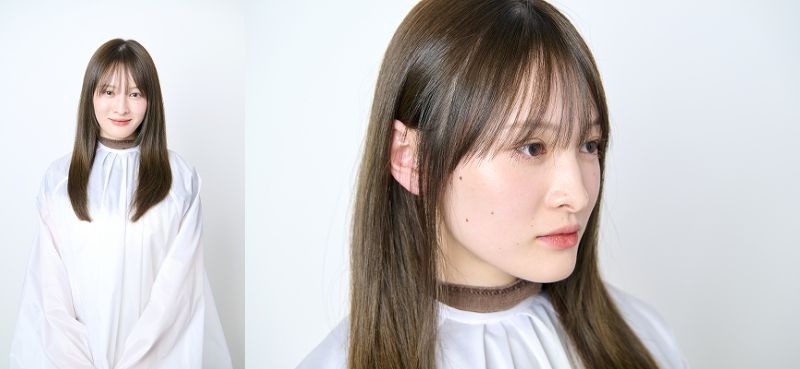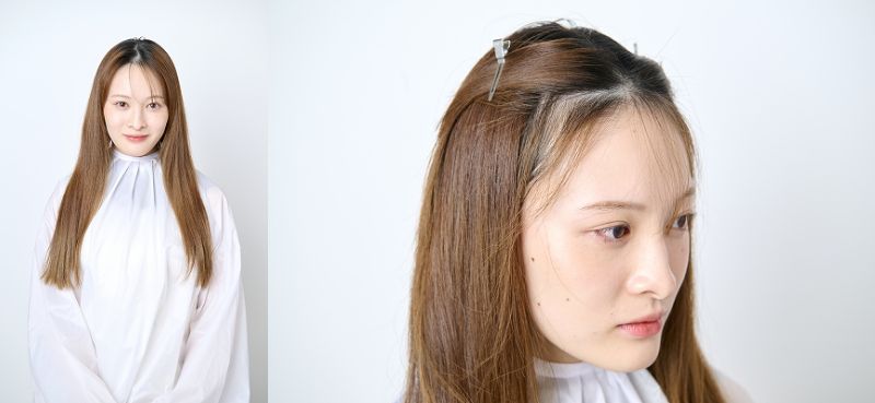 今回のモデルさんの髪質は細い・柔らかい・毛量やや多め。前髪が3つに分かれてしまってすき間ができてしまうのがお悩み。重くはしたくないとのご要望なので、ほどよい透け感が出る前髪を目指すことに。それに合わせて顔まわりを中心にレイヤーを入れて軽やかさをプラスし、髪色も透明感のある色にチェンジ。