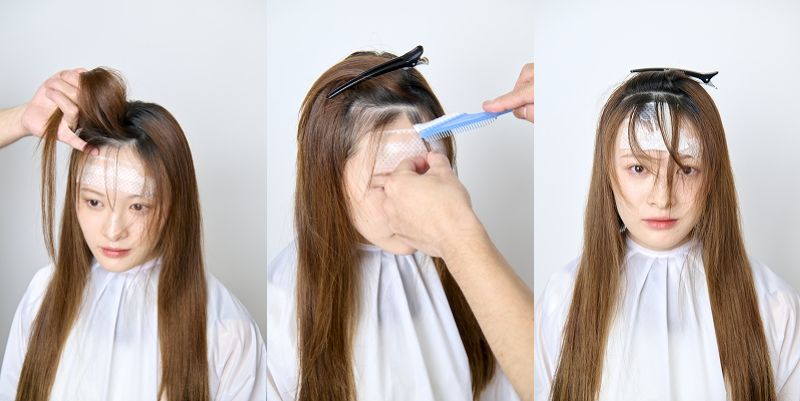- 第3線。引き出す方向は第2線と同じだが、わりと上のほうまでクセがあるので、上までしっかり塗布する。厚めバングにならないよう気をつける。
