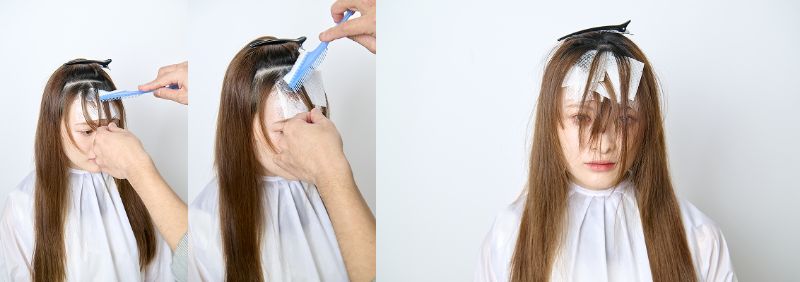 - いちばん右は真っ直ぐ下に引っ張って1剤を塗布。