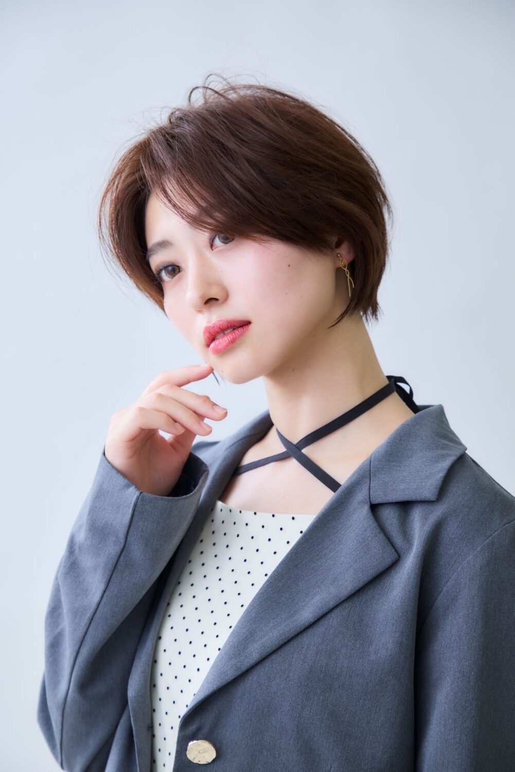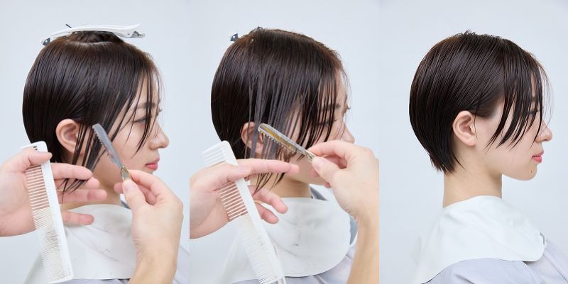 前回のカットから全体が伸びてきて、シルエットのメリハリがなくぼやけて見えてしまう。後頭部の丸みをきれいに出し、顔まわりには前下がりのニュアンスをつけて印象を引き締めつつ、束感や毛流れを出していきたい。