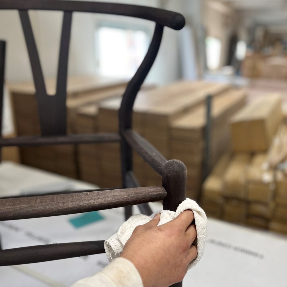 デンマーク本国から輸入したCH24のフレームに、泥を塗布、乾拭き、乾燥、水洗いの工程を繰り返すことで、一般的なウレタン塗装では表現できない木の質感を活かした味わい深い仕上げとなっている。