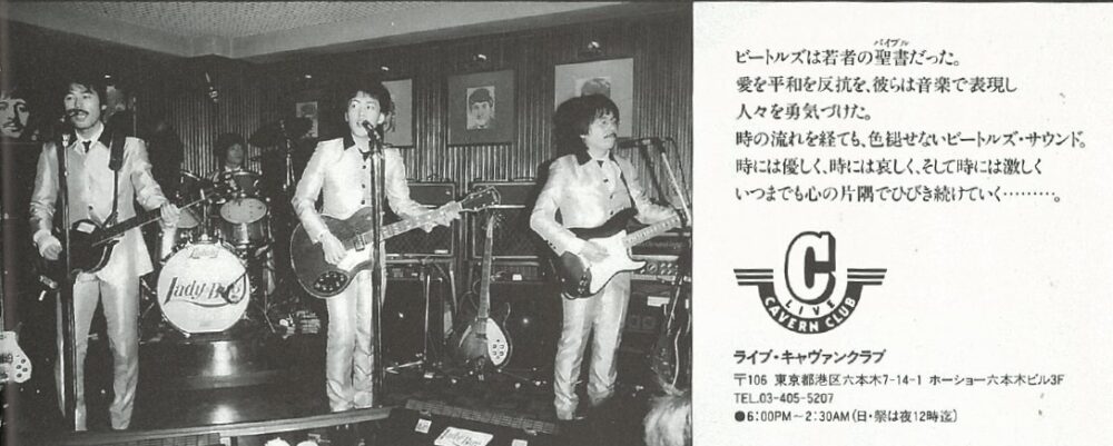この番組については過去に一度触れたことがある。あらためて説明すると、来日公演から16年経った1982年、その影響はいまどのような形で残っているのかをNHK教育らしく真面目に検証したもの。その中でビートルズ世代が今もビートルズの音楽を楽しむ場所、ビートルズ専門のライブハウスとして紹介されたのだ。紹介と言ってもNHK教育なので宣伝要素はない。ビートルズ世代のベテランサラリーマンを中心に若手男性社員やOLなど、客へのインタビューがメインで、皆一様に「日々の仕事の疲れを癒すためにキャバンに来る」という趣旨のコメントだった。当時15歳のわたしは、ビートルズは懐メロではないと思っていたので、懐古趣味な扱いに抵抗はあったが、ビートルズの生演奏が聴けるライブハウスは魅力的で、いつか一度キャバンに行ってみたいと興味を持ったのであった。