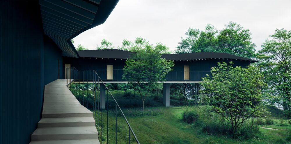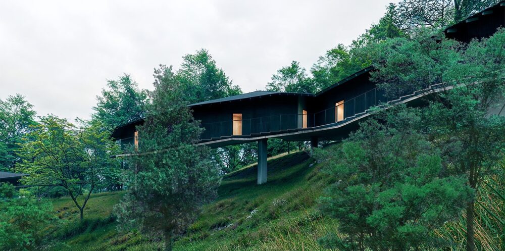 SSH No.4は18室のゲストルーム、レストランとバー、天然温泉、ジムとウェルネス専用スペースを備えたラグジュアリーな施設となる予定だ。妹島氏のデザインは細い柱に支えられたピロティ形式で、建物は森林に優しく浮かぶように設計されている。敷地はなだらかに傾斜し、20メートルほどの高低差が背後の山々へと連続している。敷地内に入ると道路からの騒音が遠のき、深い森林が広がる。建築は地形に沿って屈折し、道路と距離を置き、地面から少し持ち上がり森の中に浮遊し、やがて森に溶け込んでいく。黒い外壁は濃い緑に同化し、暗い外観は密集した葉に溶け込み、ヒノキの木で仕上げられた暖かい客室が森の中でランタンのように柔らかく浮かび上がる。デザインは軽やかさ、ゲストのプライバシー、空間の移動感覚を強調し、妹島氏の建築言語の特徴を示している。