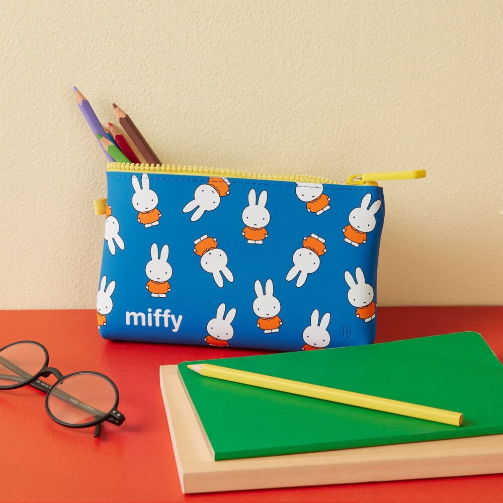 オレンジのワンピース姿のミッフィーをプリント。柔軟で水に強いシリコン素材のジップポーチ。旅行に最適。