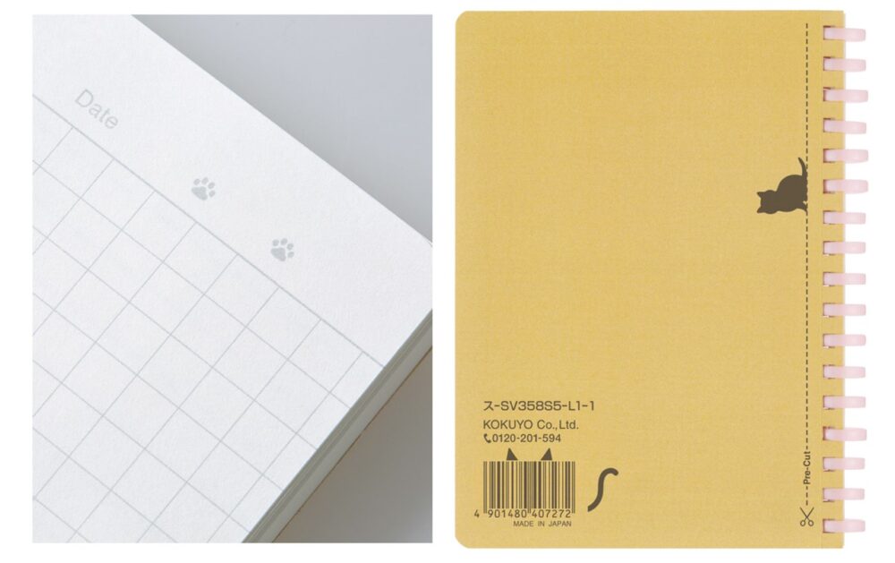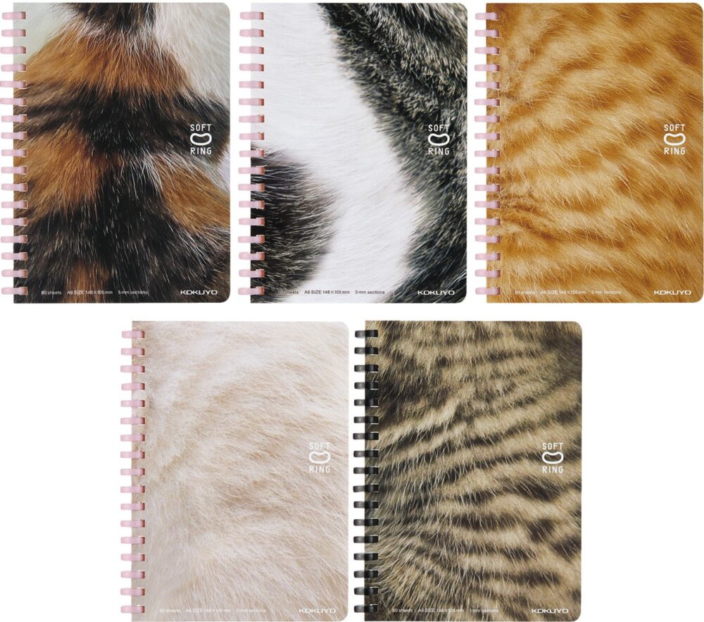 やわらかリングを肉球に見立て、表紙には子ねこの毛並みをあしらった。三毛猫、サバ白、茶トラ、白猫、キジトラの5柄を展開。サイズは子ねこをイメージしたコンパクトなA6。リング色は肉球をイメージしたカラーで、罫線や裏表紙にも子ねこがあしらわれている。