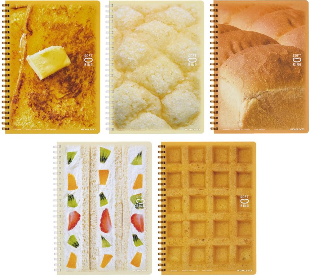 ニス加工によるシズル感のある表紙で、ふわふわのパンのやわらかさを表現。フレンチトースト、メロンパン、食パン、フルーツサンド、ワッフルの5柄を展開。A5サイズでリング色はそれぞれのパン生地をイメージ。日付欄や裏表紙にもパン柄があり、開閉時ともに可愛い。