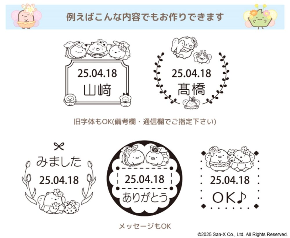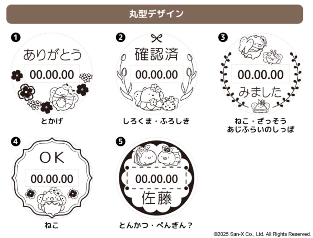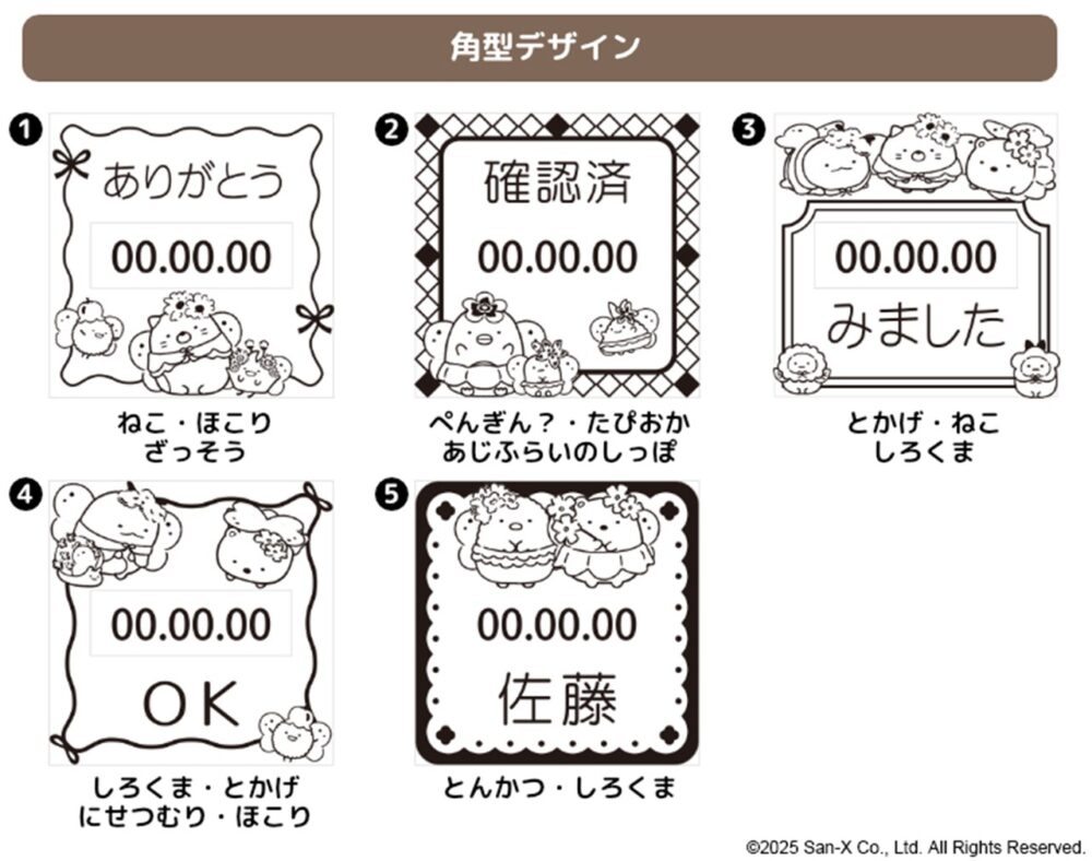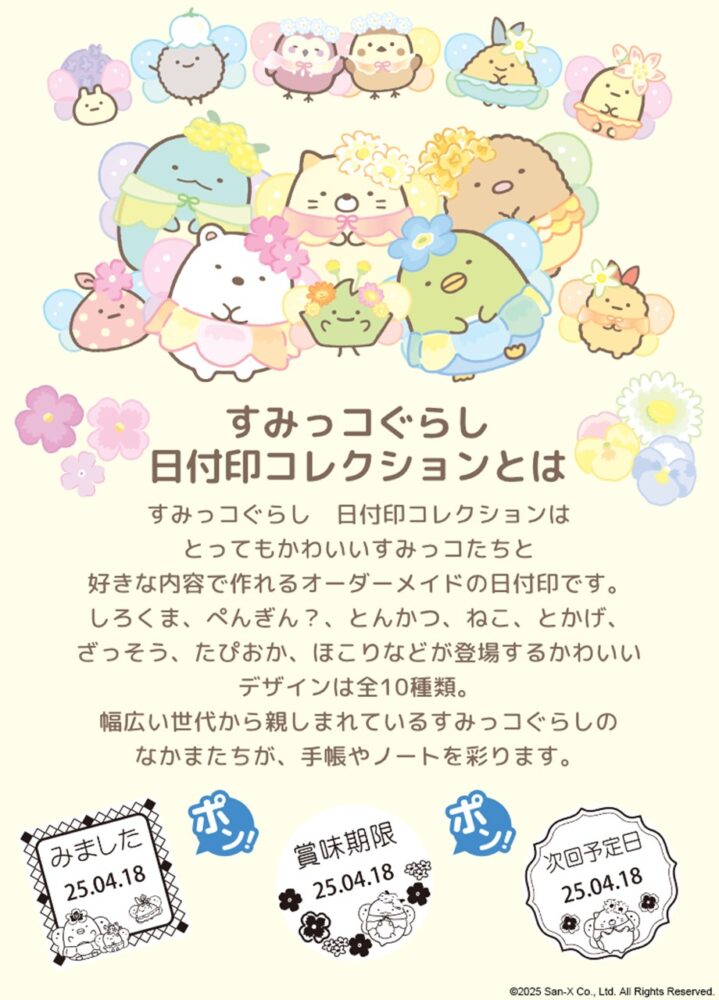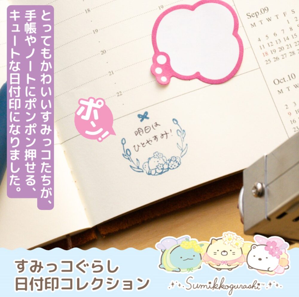 「すみっコぐらし 日付印コレクション」は、「手帳やノートに使える、すみっコぐらしの日付入りのはんこは作れませんか?」という声に応えて企画された、すみっコぐらしの日付入りはんこである。とってもかわいいすみっコぐらしと好きな内容で、オーダーメイドで作ることができる。幅広い世代から親しまれているすみっコぐらしの仲間たちが、手帳やノートを彩る。