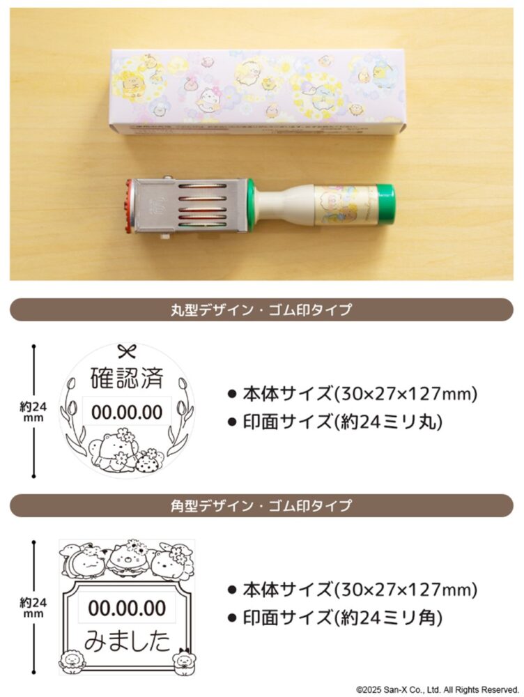 日付印本体のサイズは横30×縦27×高さ127ミリ。印面サイズは丸型が約24ミリ、角型が約24ミリ。スタンプ本体の持ち手部分や専用BOXにも、かわいいすみっコぐらしがあしらわれている。