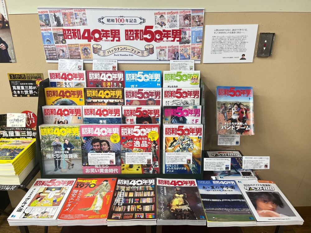 同店は『昭和40年男』の売り上げが全国でも屈指の店舗として知られ、創刊以来多くの読者に親しまれてきたが、今回の「バックナンバーフェア」の特設コーナーでは、厳選されたバックナンバーが並び、昭和40年生まれ前後の世代はもちろん、どの世代の人でも楽しめるものになっている。