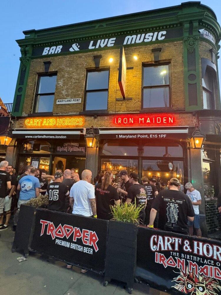月日の経つのは早いもので、あっという間に渡英の日がやってきた。公演日の前日にロンドンに到着。この日は会場近くに設置されたオフィシャルPOP-UPパブ「EDDIE’S DIVE BAR」で「Trooper Beer」を飲んで会場周りの雰囲気を確かめ、次に会場近くのスティーブ・ハリス(B)がアイアン・メイデンを結成した場所であるパブ「Cart & Horses」へ。スティーブ・ハリスの地元である、ここStratfordで開催するライブ前日ということでこの日は昼からパブは大盛況。初代メンバーであるトニー・ムーアのライブも行われていて当然のごとくメイデン・ファンであふれかえっていて、店内に入ることはできなかった。