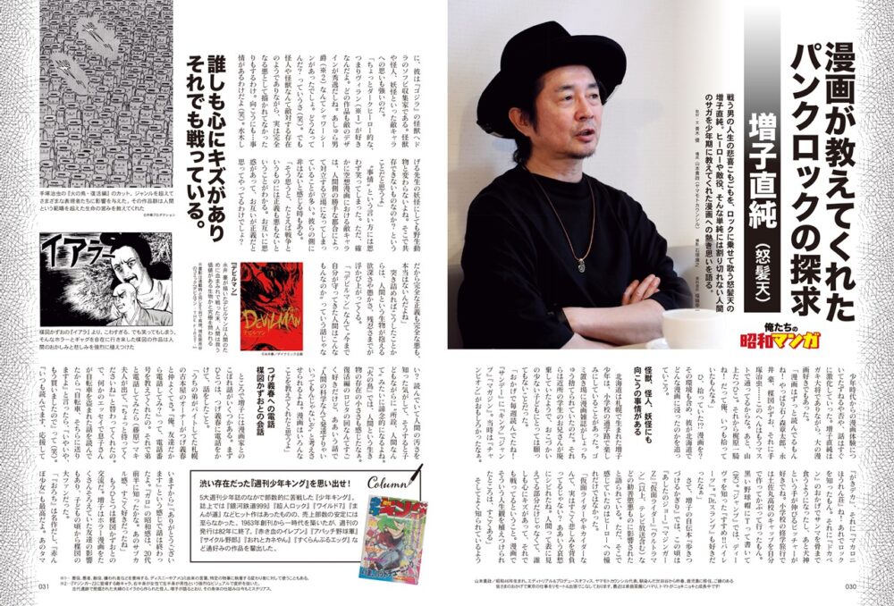 戦う男の人生の悲喜こもごもを、ロックに乗せて歌う怒髪天の増子直純。ヒーローや敵役、そんな単純には割り切れない人間のサガを少年期に教えてくれた漫画への熱き思いを語る。