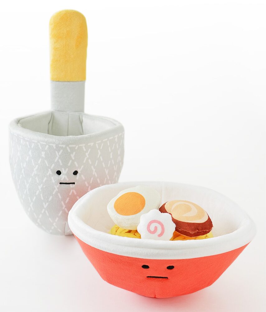 本商品は、「ラーメンのぬいぐるみがあったら面白いのでは」との一言からスタートした。まず着想を得たのは、麺をゆでる際に使う“てぼ網”だった。その後「てぼがあるなら、どんぶりも」「どんぶりがあるなら、麺や具材も」という発想が広がり、ラーメンそのものをぬいぐるみとして再現するというユニークなアイデアが形となった。