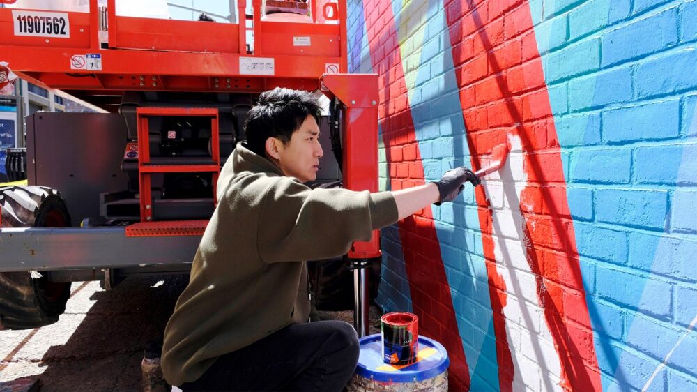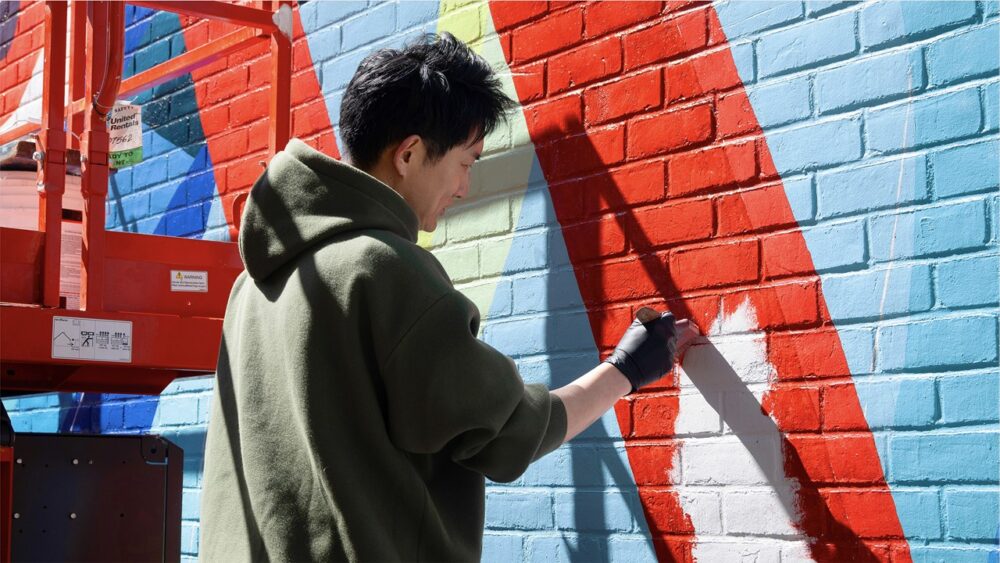 アーティストとしての花原にとって《Water Game》は、それまでの自身の作品に強く影響してきた「日本の美学にあるモダンなミニマリズム」から一歩踏み出す挑戦でもあり、この壁画では、ニューヨーク、そしてダンボの持つ力強くエネルギッシュな空気を取り入れ、まるで化学反応するかのように、鮮やかで躍動感あふれる色彩と動きのあるビジュアルへと昇華させている。