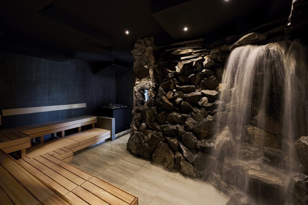 まるで洞窟の中に迷い込んだかのような、岩に囲まれたサウナ空間。足元には里山の天然水が流れ、岩壁から滴り落ちる水がサウナ室内に湿度とマイナスイオンをもたらす。この滝サウナの最大の特徴は、30分に一度、岩の上部から大量の里山の天然水が一気に流れ落ちる「滝行体験」だ。熱気に包まれたサウナ室での冷水シャワーは、身体と心を一気にリセットするような爽快感をもたらす。水は常温ながらひんやりとしており、熱と冷のコントラストを同時に味わう、まったく新しいリフレッシュ体験がここにある。