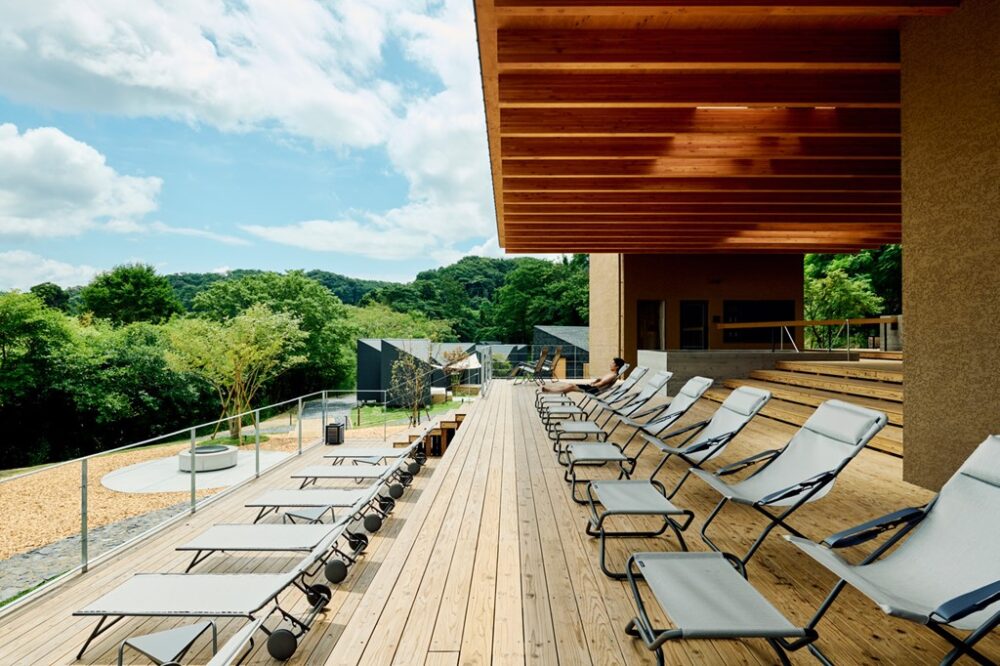 自然の風と調和する多彩な休憩スタイルが提供される。屋根付きのデッキでは、季節の風景を眺めながらととのい時間を満喫でき、里山の風を直に浴びれるリクライニング席や、雨でも安心のテント内スペースでは昭和西川のMuAtsuマットレスでゆっくりお休みいただける。天然の岩の上に座ったり寝転んだりできる場所もあり、自然と一体になる休憩が楽しめる。さらに、メイン棟の屋内にはソファ席もあり、雨天や寒冷時でもゆったり過ごせる。