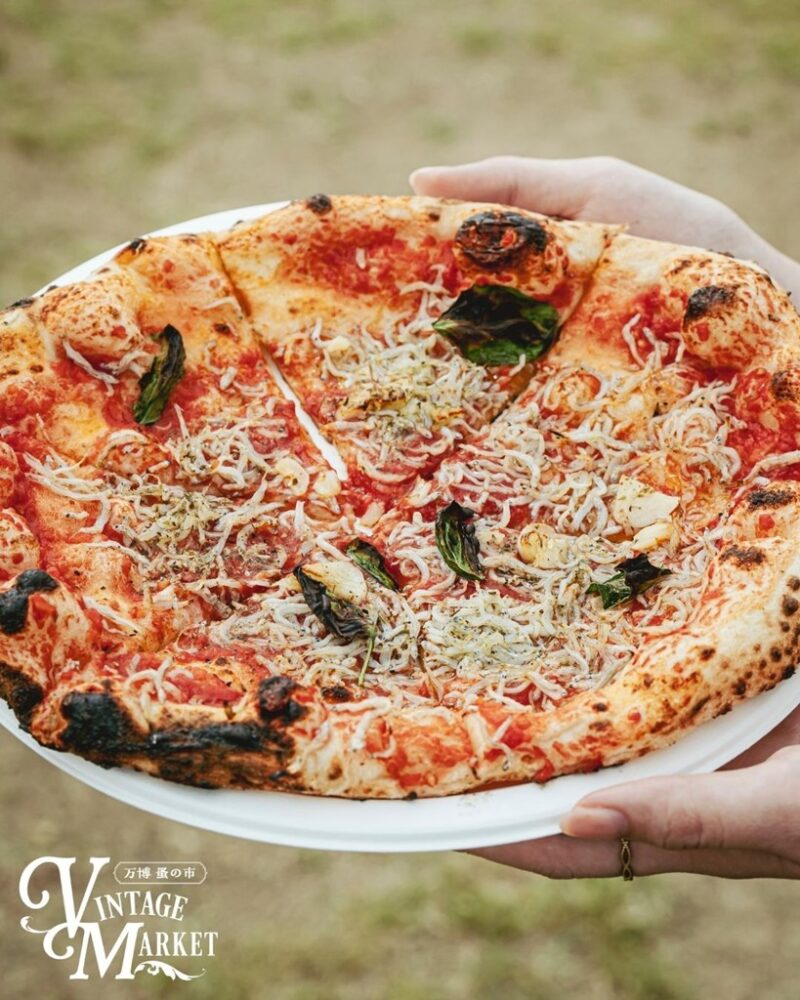 また、アンティーク・ヴィンテージ品と音楽を楽しみながら、淹れたてのコーヒーや焼き立てのピザ、フランス発祥のカスクード、見た目も可愛いスイーツで一息つけるエリアも提供される。味の良さはもちろんのこと、自然豊かな万博記念公園に『映える』オシャレなグルメだ。