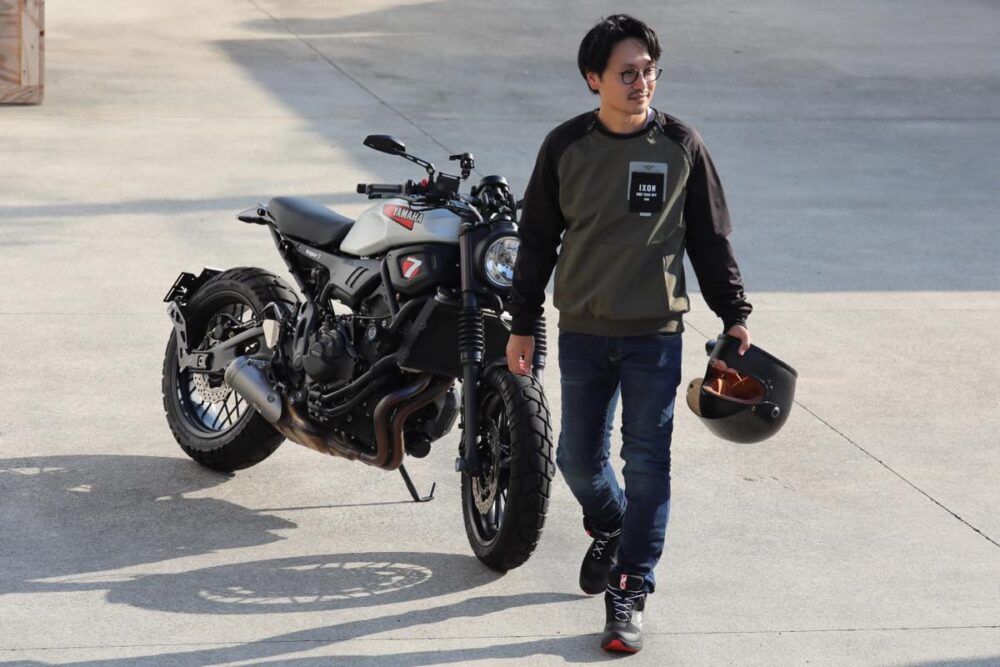 目を引くヤマハのオールドレーサースタイルは単色でシンプルなコーディネイトが相性抜群。