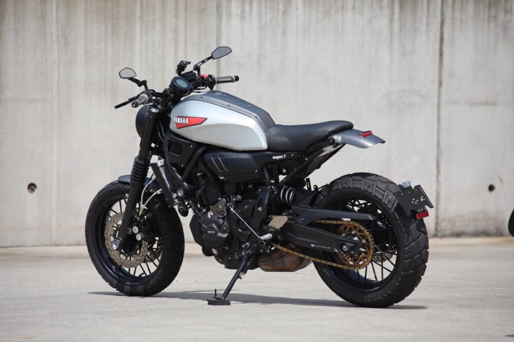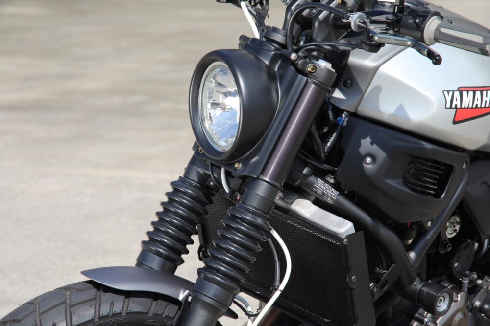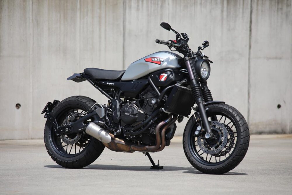 今回紹介するXSR700もそんなスクランブラーテイストが盛り込まれた1台となる。ドイツのJvB-motoが制作したスーパー7をベースに、滋賀を拠点に海外パーツの卸・販売をしているモトサロンが、同社の取り扱うガードパーツを組み込むなど、実用面をさらにアップさせたスペシャルな1台となっている。