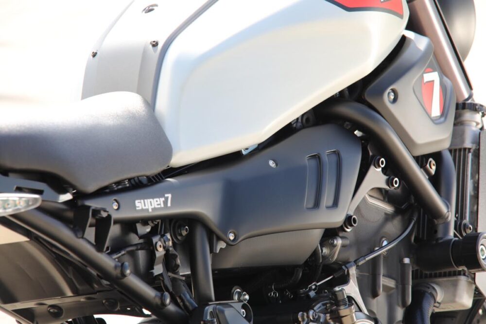 タンクからシートにかけての下側に、JvB Motoのフレームパネルキットとサイドぺネルキットが装着されている。とくにサイドパネルはノーマルの特徴あるサイドパネルとの入れ替えとなるため、車体全体の雰囲気を大きく変えている。