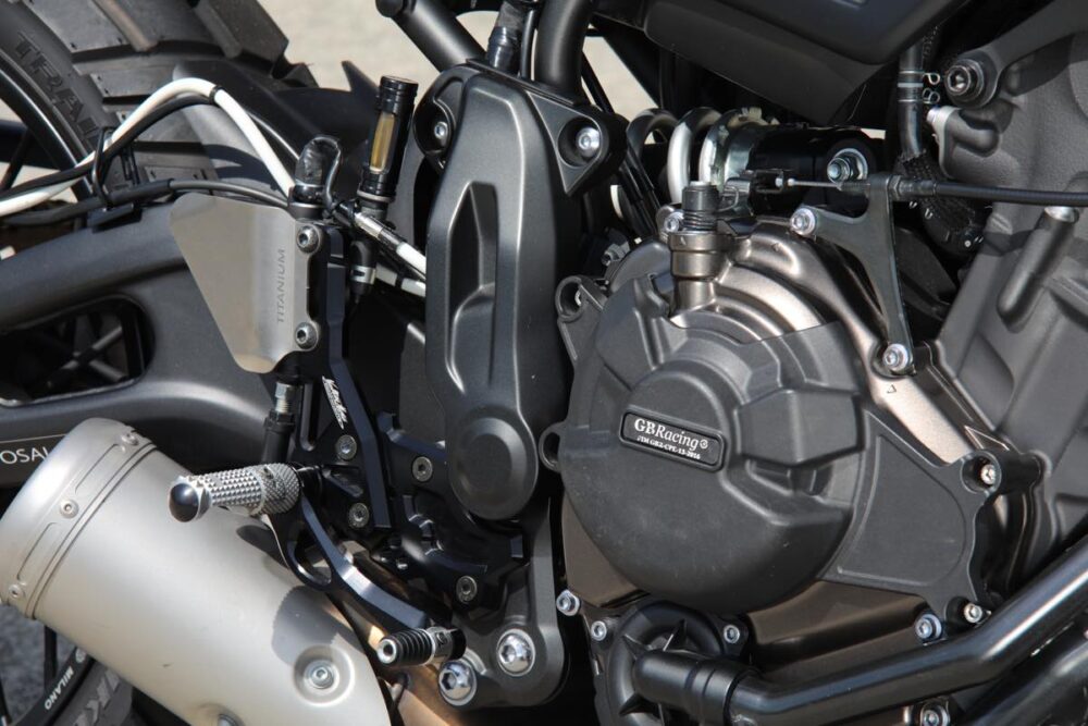 もしもの転倒時に備えて耐衝撃性に優れたガラス繊維配合率60%のエンジニアプラスチックを使ったGBRacing FIM公認 エンジンカバー(2次カバー )が装着されている。Valter Motoのバックステップでポジションを変更している。