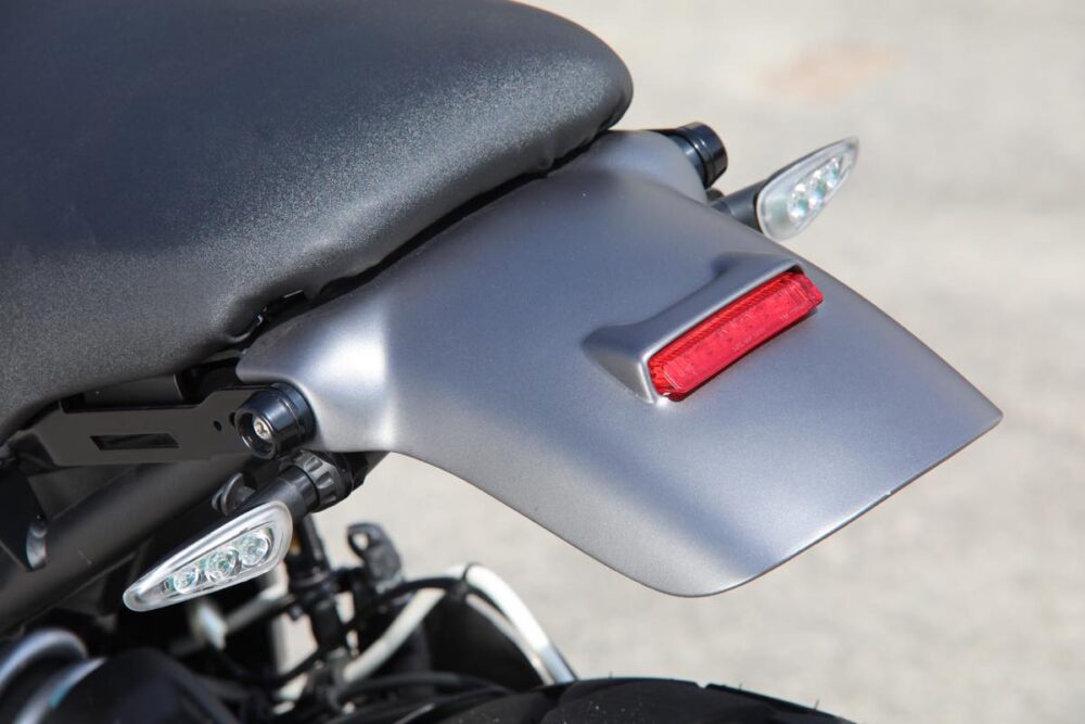 シートレール後ろ側をなくしてシングルシート仕様にしたこと、アイデンティティともいえる3つのホールが空いたサイドカバーをなくし、ヘッドライトの飛び出しを極力抑えたことで、雰囲気はガラリと変わる。
